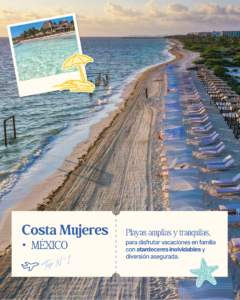 Costa Mujeres se convirtió en uno de los refugios favoritos para quienes buscan desconectar del ritmo diario sin renunciar a la comodidad. Sus playas amplias y tranquilas invitan a caminar descalzo sobre la arena fina mientras el mar, de un azul suave, acompaña cada paso. Es un destino ideal para familias que quieren combinar descanso con entretenimiento: desde actividades acuáticas hasta tardes de juegos en la playa. Los atardeceres, que tiñen el horizonte de tonos dorados y rosados, se vuelven el escenario perfecto para cerrar cada día con un recuerdo inolvidable.